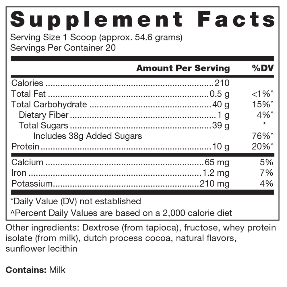 Other Ingredients: Dextrose (from tapioca), fructose, whey protein isolate (from milk), dutch process cocoa, natural flavors, sunflower lecithin.