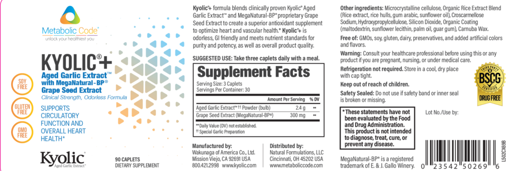Kyolic+ formula blends clinically proven Kyolic® Aged Garlic and MegaNatural®-BP proprietary Grape Seed Extract to create a superior antioxidant supplement to optimize heart and vascular health.* Kyolic+ is odorless, GI friendly and meets nutrient standards for purity and potency, as well as overall product quality.