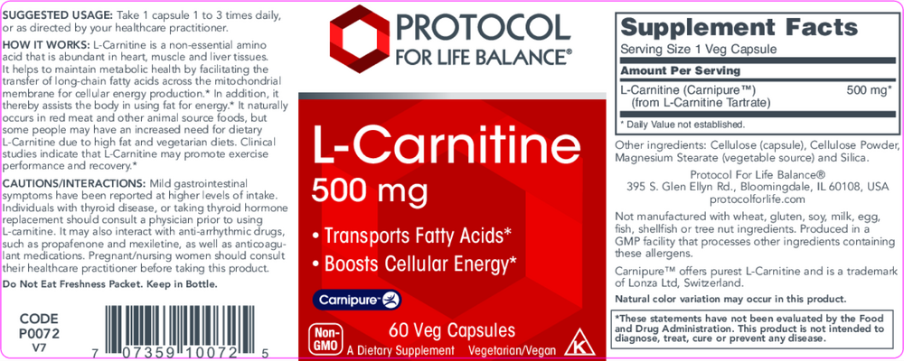 L-Carnitine is a non-essential amino acid that is abundant in heart, muscle and liver tissues. It helps to maintain metabolic health by facilitating the transfer of long-chain fatty acids across the mitochondrial membrane for cellular energy production.* In addition, it thereby assists the body in using fat for energy.* It naturally occurs in red meat and other animal source foods, but some people may have an increased need for dietary L-Carnitine due to high fat and vegetarian diets. Clinical studies indicate that L-Carnitine may promote exercise performance and recovery.*