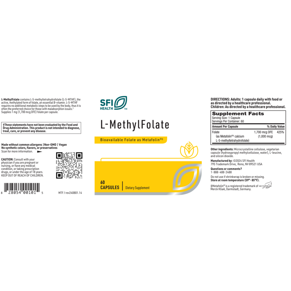 Folate deficiencies are common as many individuals do not consume enough folate-rich foods and folate is readily destroyed by cooking or processing. Although typically included in multivitamins, some individuals do not effectively methylate and convert folic acid into its bioactive form thus are still at risk of deficiency. L-5-MTHF, an active, methylated form of folate, requires no additional metabolic steps to be used by the body, thus it is often the preferred choice for women, children, and those with absorption or metabolic defects. L-5-MTHF efficiently supports methylation, DNA biosynthesis, homocysteine metabolism, and nervous system function.* Supplies 1,700 mcg DFE folate per capsule.