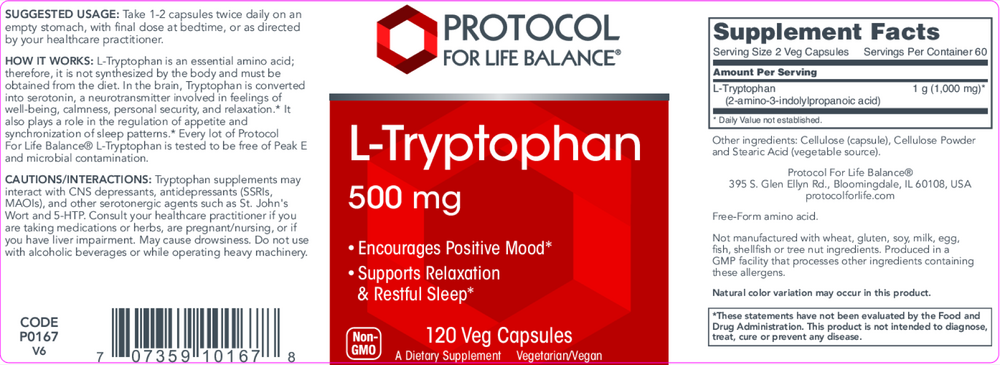 L-tryptophan is an essential amino acid; therefore, it is not synthesized by the body and must be obtained from the diet. In the brain, tryptophan is converted into serotonin, a neurotransmitter involved in feelings of well-being, calmness, personal security, and relaxation.* It also plays a role in the regulation of appetite and synchronization of sleep patterns.* Every lot of Protocol For Life Balance® L-tryptophan is tested to be free of Peak E and microbial contamination.