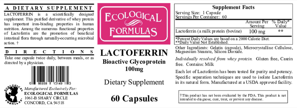 Lactoferrin 100 mg by Ecological Formulas is a dietary supplement designed to promote a healthy balance of bacteria in the digestive system.* The key ingredient featured in Lactoferrin 100 mg by Ecological Formulas is a purified derivative of whey protein associated with important iron binding properties. It may support the growth of healthy bacteria in the digestive tract.*