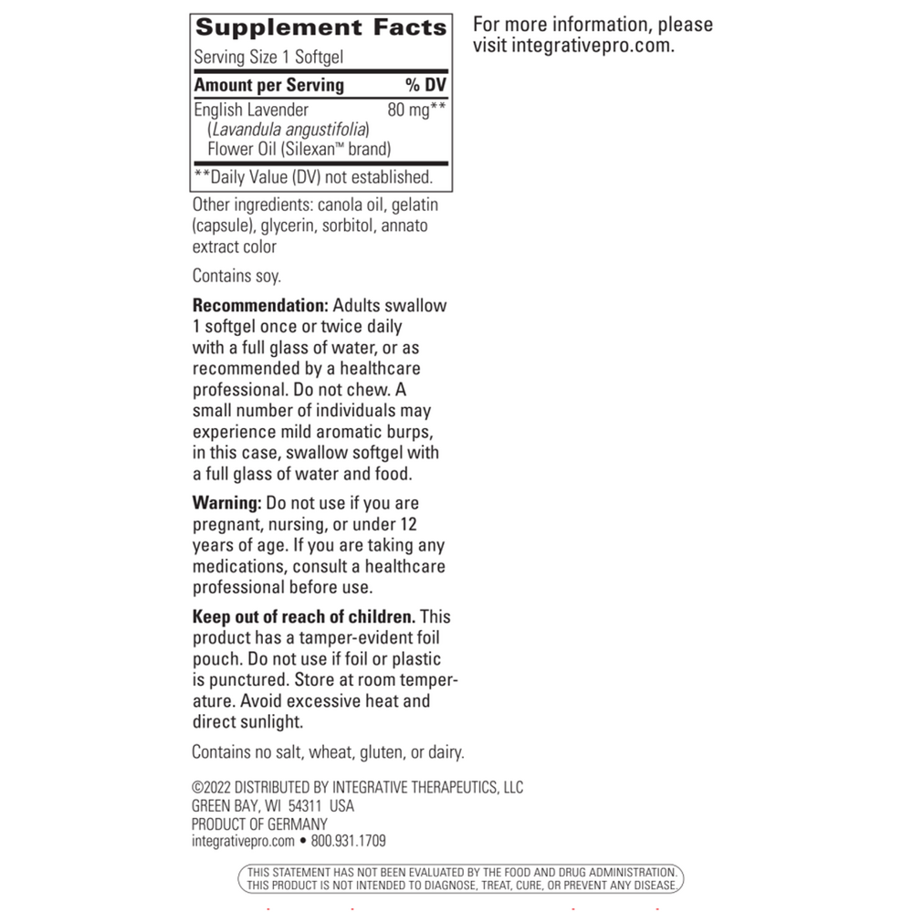 Lavela WS 1265 is a clinically studied oral lavender essential oil to calm nervousness.*It is a clinically studied, non-habit-forming oral lavender essential oil that has been shown to promote relaxation, foster sleep quality in those experiencing occasional tension, and calm nervousness.* Lavela WS 1265 (also known as Silexan) is an oral lavender essential oil with demonstrated efficacy and safety in published, controlled clinical trials. Daily use of the studied material has been proven to provide a statistically significant reduction of nervousness compared to placebo by four weeks.* This product is not intended to diagnose, treat, cure, or prevent any disease.