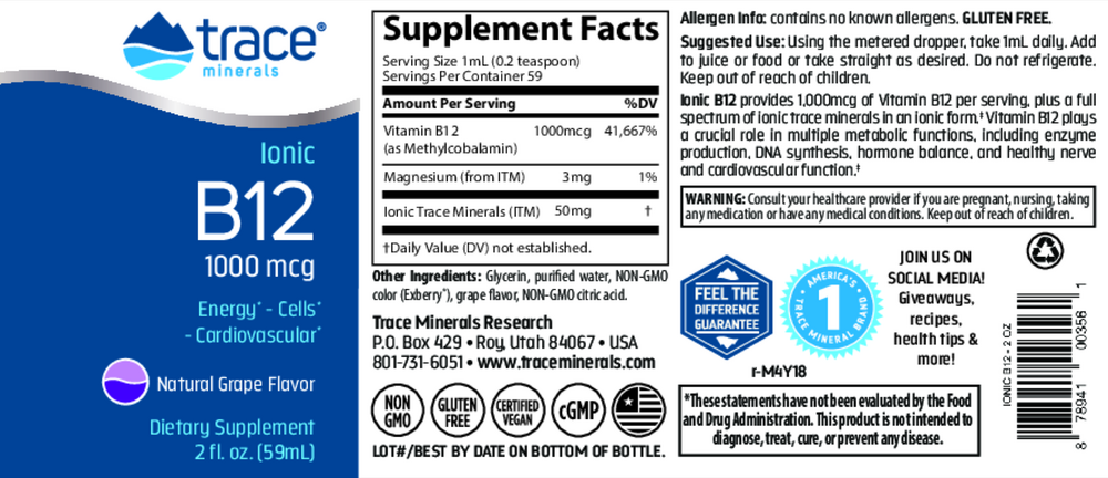 Ionic B12 – Provides 1,000mcg of Vitamin B12 per serving, plus a full spectrum of over 72 naturally-occurring ionic trace minerals in an ionic form. Vitamin B12 plays a crucial role in multiple metabolic functions, including enzyme production, DNA synthesis, hormone balance, and healthy nerve and cardiovascular function.*