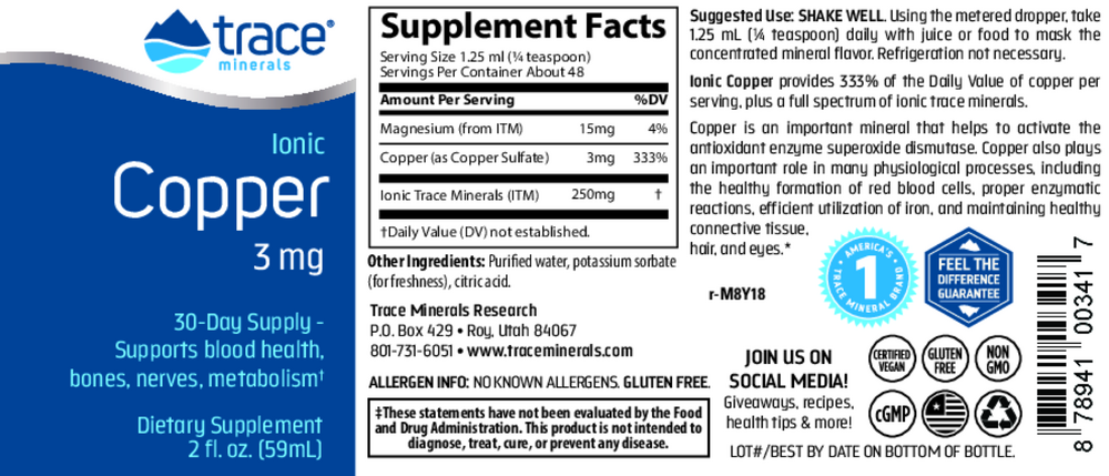 Ionic Copper provides 150% of the Daily Value of copper per serving, plus over 72 naturally occurring ionic trace minerals. Copper is an important mineral that helps to activate the antioxidant enzyme superoxide dismutase. Copper also plays an important role in many physiological processes, including the healthy formation of red blood cells, proper enzymatic reactions, efficient utilization of iron, and maintaining healthy connective tissue, hair, and eyes.*