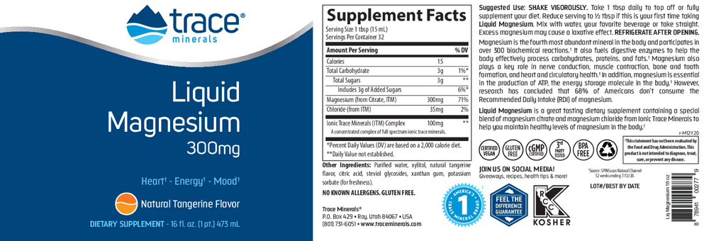 Liquid Magnesium is a great tasting dietary supplement containing a special blend of magnesium citrate and magnesium chloride from ConcenTrace® to help maintain healthy levels of magnesium in the body.† It has an all natural tangerine flavor that tastes great.