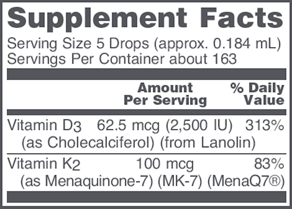 Liquid D-3 & MK-7 combines vitamins D-3 and K-2, two nutrients extensively researched for their roles in the health of bones, teeth and the cardiovascular system.* Vitamin D-3 works with calcium to support bone health, and more recent studies indicate it’s important for immune system health as well.* MenaQ7® MK-7 is a unique soy-free, bioavailable form of vitamin K-2 that plays a critical role in arterial health through its ability to support proper calcium metabolism in blood vessels and arteries.* Vitamin K-2 is also important for the formation of strong, healthy bones.*