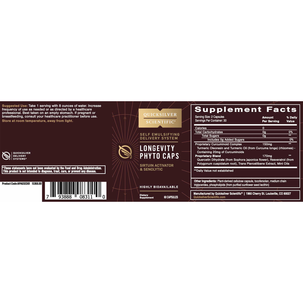 Longevity Phyto Caps is an anti-aging formula specifically designed to support healthy aging by facilitating better cellular function, clearance of damaged cells, and stimulate longevity pathways. Each two-capsule serving provides a curcuminoid complex, quercetin, resveratrol, and trans pterostilbene in our highly bioavailable SEDS delivery technology for fast and efficient absorption of ingredients.*Aids cellular longevity and function*.