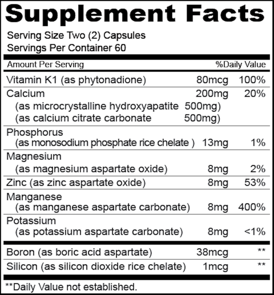 Microcrystalline Hydroxyapatite is prepared from raw bovine bone with a special low temperature process, providing a well absorbed natural source of calcium. It is supplied with a mineral blend to promote normal bone health and density.*