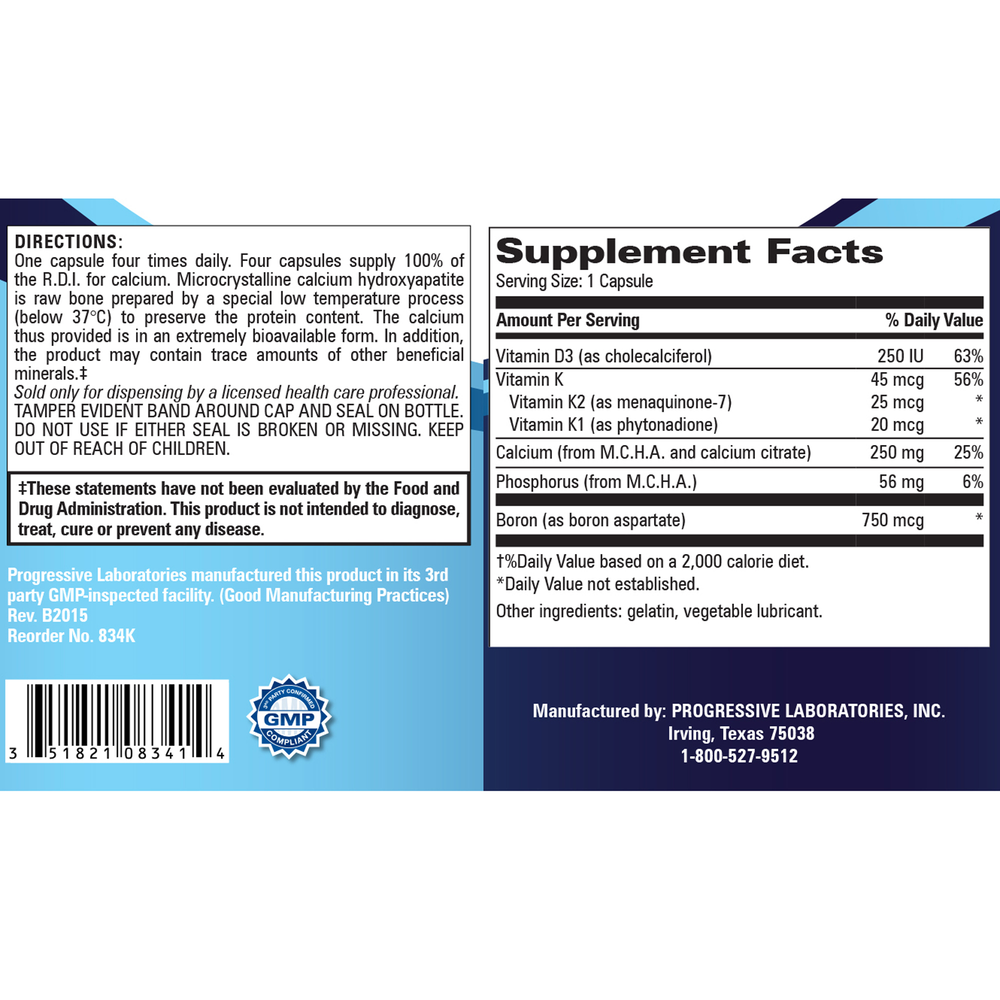 Microcrystalline Hydroxyapatite (M.C.H.A.), also known as Micro-crystalline Calcium Hydroxyapatite Complex (M.C.H.C.), is derived from raw bone and prepared by a special low temperature process (below 37° C) to preserve the protein content. The calcium thus provided is in an extremely bioavailable form. Vitamin D3 is because it is required for the absorption and utilization of calcium and phosphorus and is especially important for normal growth and development of bones and teeth.* Vitamin K (both K1 and K2) is added support the synthesis of osteocalcin, the protein in bone tissue upon which calcium crystallizes.* However, because of its role in blood clotting, patients who have a problem in this area or who are taking medications to prevent blood clotting must carefully monitor their intake of vitamin K.