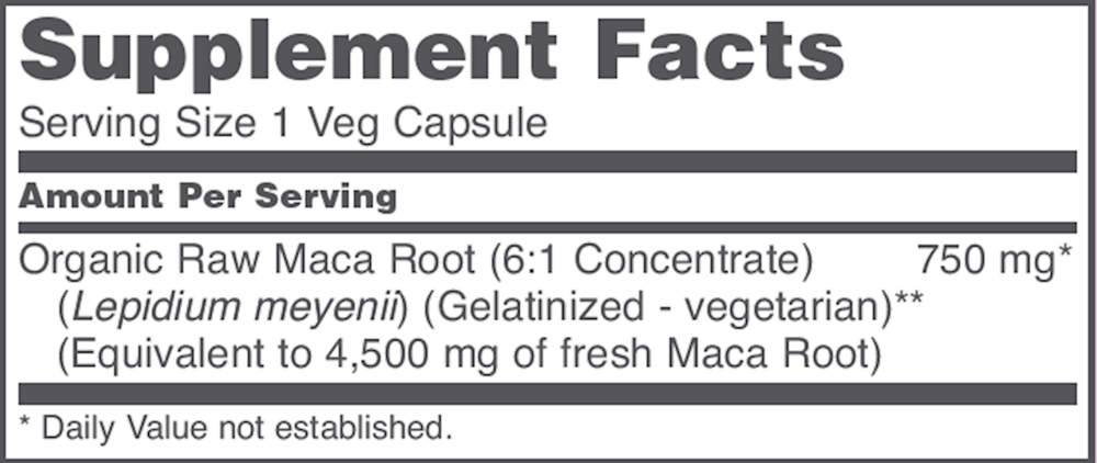 The herb maca (Lepidium meyenii) is native to the Andes region of Peru, where it has a long history of use both as a food and a general energy tonic.* Modern scientific studies indicate that natural constituents in maca may help to support healthy sexual activity in males, without exerting any direct effect on endocrine function.* Protocol for Life Balance® Raw Maca is gelatinized to remove starch for a more concentrated product.