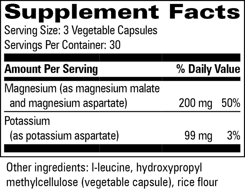 Magnesium and Potassium Aspartates have been found effective for relief of fatigue attributed to a variety of origins. Magnesium is not a trace mineral but a major entity in the body. Most of it is in the bones and intracellular fluids. Magnesium is absolutely essential for life. It is necessary for every major biologic process including the metabolism of glucose, production of cellular energy and the synthesis of nucleic acids and protein.*
