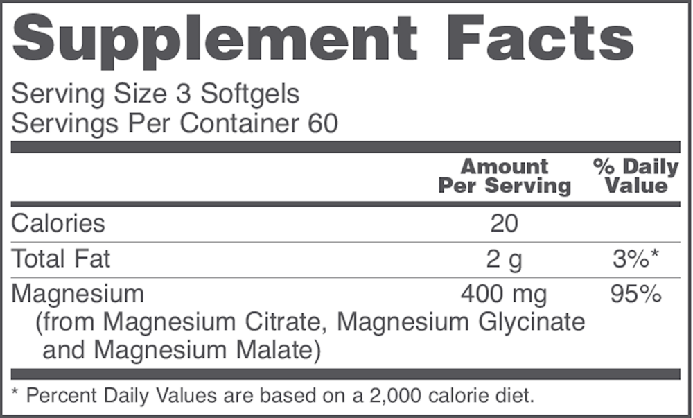 Magnesium is a mineral that is essential for a wide range of fundamental cellular functions as it is a cofactor in at least 300 different enzymatic reactions.* Magnesium is well known for its roles in healthy cardiovascular function and bone formation and mineralization.* It is also critical for the regulation of muscle contraction and nerve conductivity through its influence on cell membrane permeability, as well as on the maintenance of the proper charge balance of the bodily fluids.* In addition, Magnesium is essential for the production of cellular energy from the metabolism of carbohydrate and fat.* These softgels combine Magnesium Citrate with Magnesium Glycinate for superior bioavailability.