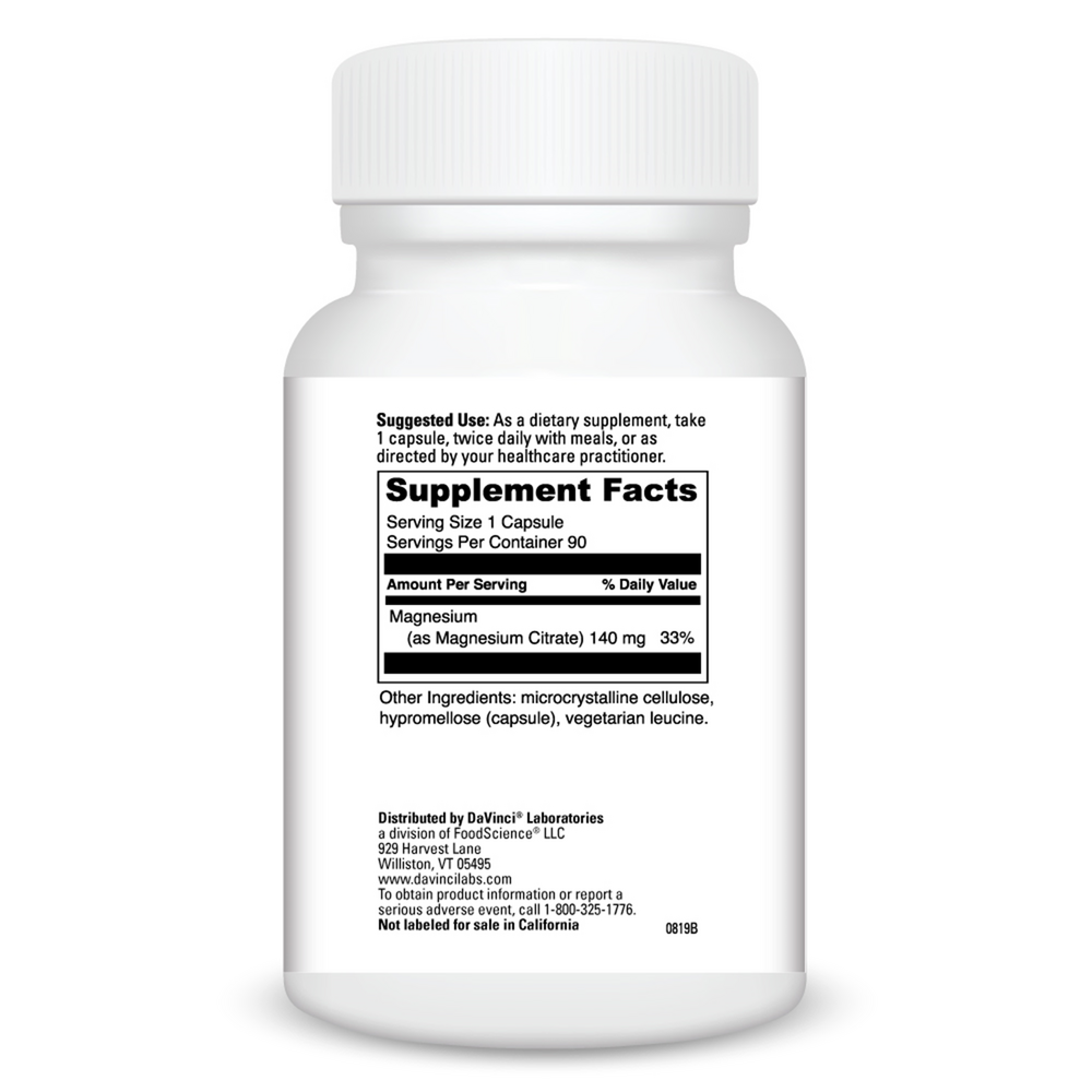 A dietary supplement to support proper nerve and muscle functions.* Magnesium also aids the body in maintaining proper pH balance, healthy blood pressure already within normal range and normal body temperature.* It is involved in carbohydrate and mineral metabolism and assists in calcium and potassium uptake. Each vegetarian capsule contains 870 mg of Magnesium Citrate, yielding 140 mg elemental magnesium.