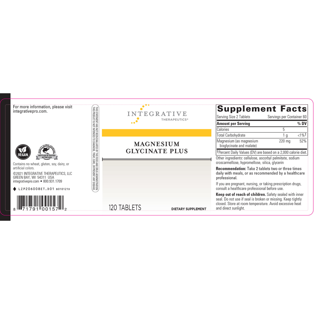 Provides bioavailable magnesium supplementation for cardiovascular support and healthy muscular and neurological function.* Contains magnesium glycinate chelate for better tolerance.* This product is not intended to diagnose, treat, cure, or prevent any disease.