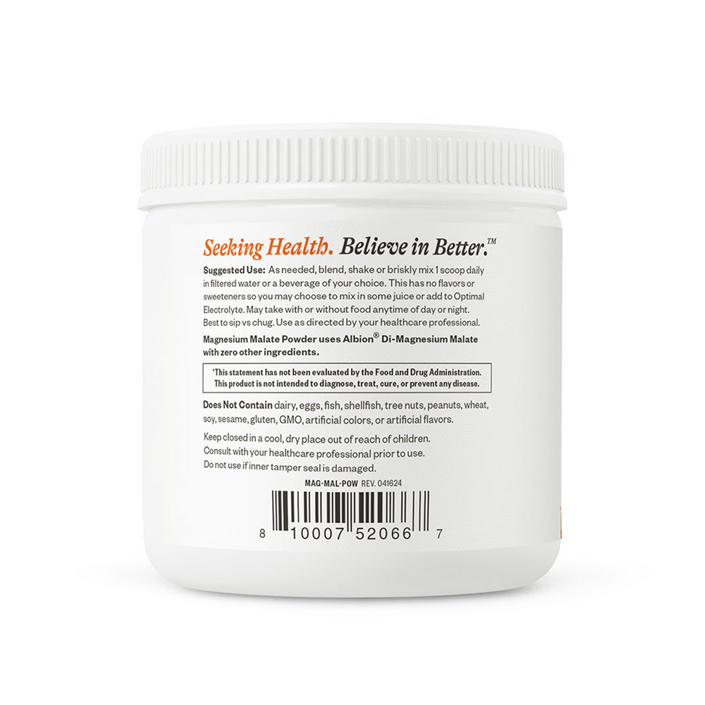 Magnesium Malate Powder by Seeking Health provides 500 mg of magnesium (as dimagnesium malate) per serving. Magnesium is an abundant mineral naturally present in the body that acts as a cofactor in hundreds of enzymatic processes and systems. It helps to regulate biochemical reactions in the body, including protein synthesis, muscle and nerve function, and healthy blood pressure. It may help support healthy muscle relaxation by inhibiting calcium influx and smooth muscle contraction.