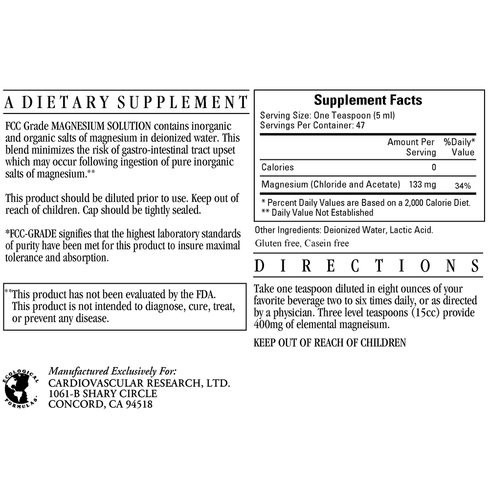 Magnesium Solution 8 oz by Ecological Formulas is a dietary supplement designed to support healthy heart, muscle and kidney function.* The magnesium content of Magnesium Solution 8 oz by Ecological Formulas helps to activate enzymes in the body that contribute to the proper production of energy.* This formula features both organic and inorganic salts of magnesium in double-distilled water to minimize the risk of stomach upset after ingestion.