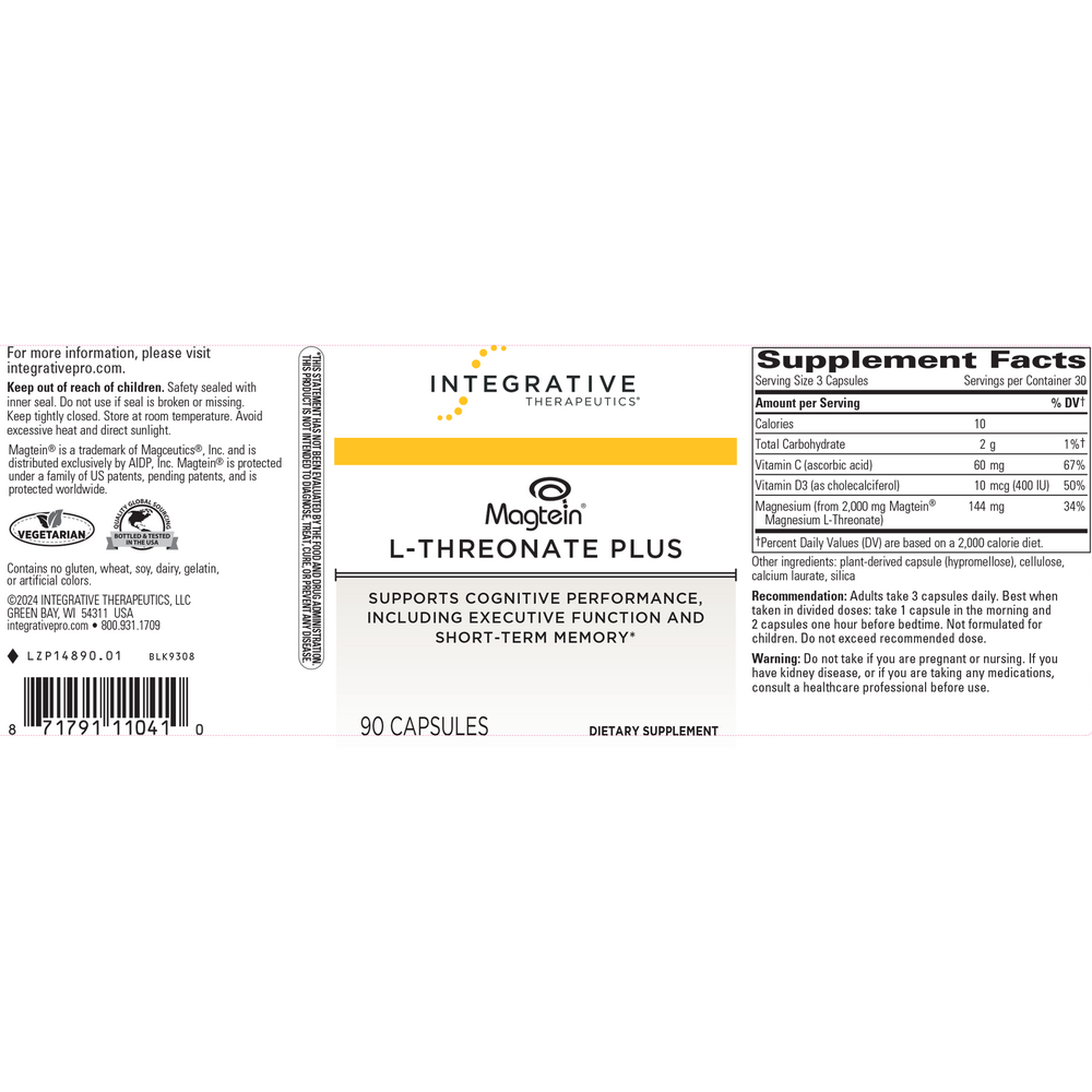 Magtein® L-Threonate Plus contains clinically studied Magtein® magnesium L- threonate with vitamins C and D3. it supports cognitive performance, including executive function and short-term memory*