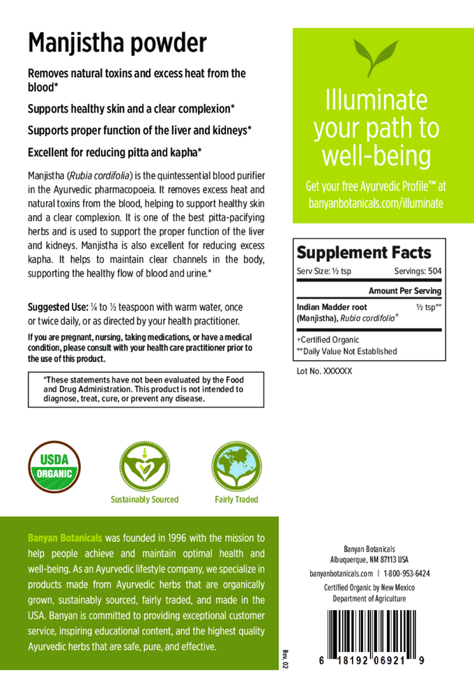 Manjistha (Rubia cordifolia) is the quintessential blood purifier in the Ayurvedic pharmacopoeia. It removes excess heat and natural toxins from the blood helping to support healthy skin and a clear complexion.* It is one of the best pitta-pacifying herbs and is used to support the proper function of the liver and kidneys.* Manjistha is also excellent for reducing excess kapha. It helps to maintain clear channels in the body supporting the healthy flow of blood and urine.*