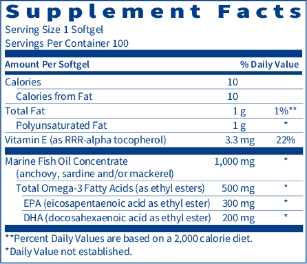 Marine Fish Oil is a concentrated product supplying 50% EPA/DHA content and is a very affordable option for daily omega-3 supplementation. Each 1 g softgel supplies a guaranteed minimum amount of 300 mg EPA and 200 mg DHA (270 mg EPA/180 mg DHA when reported as free fatty acid equivalents). Marine Fish Oil is an unflavored product free of fishy smell or aftertaste. Mixed vitamin E tocopherols maintain freshness by retarding lipid peroxidation, preserving the light, clean taste. Each batch of softgels is analyzed by an independent testing laboratory to verify oil purity and omega-3 potency. Cholesterol-free.
