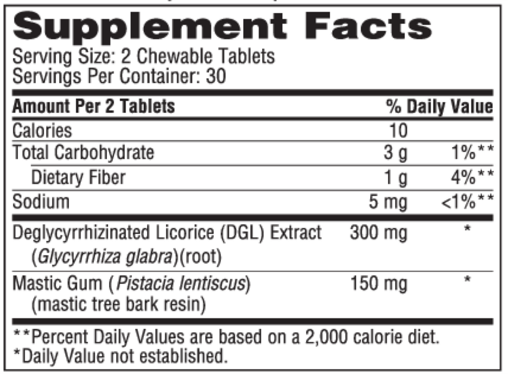 Mastic Gum/DGL is a cinnamon flavored chewable tablet containing DGL (deglycyrrhizinated licorice root and rhizome extract) and mastic gum to support healthy digestion and gastrointestinal function.* This product can help alleviate gastrointestinal discomfort associated with occasional indigestion.*