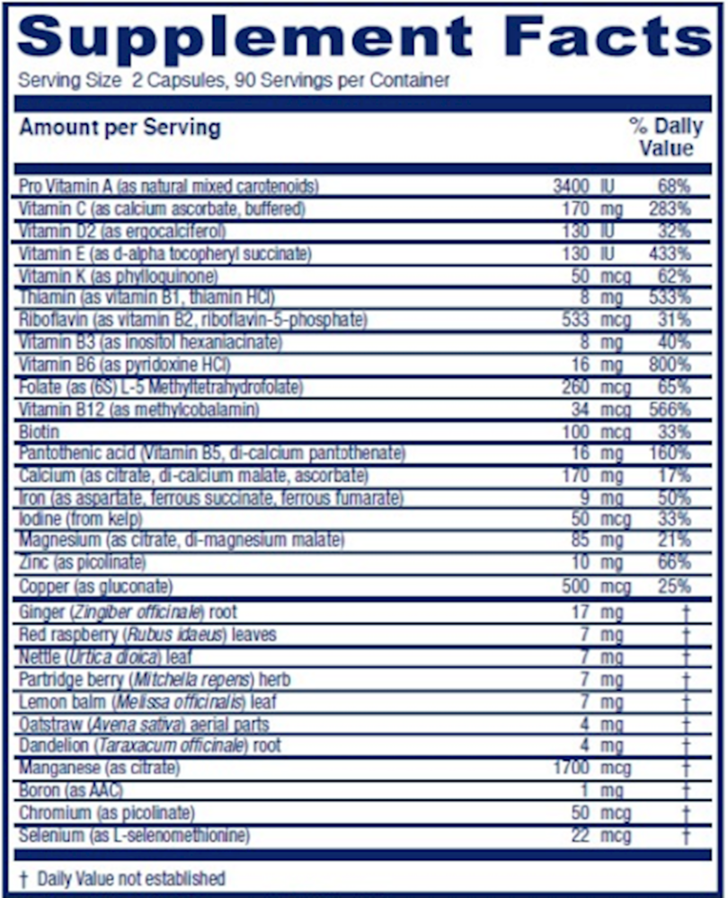 A high quality prenatal multi-vitamin mineral offering comprehensive support of key nutritional needs for mother and developing baby before pregnancy, in the planning and preparation stages, during pregnancy, and after while breastfeeding.*