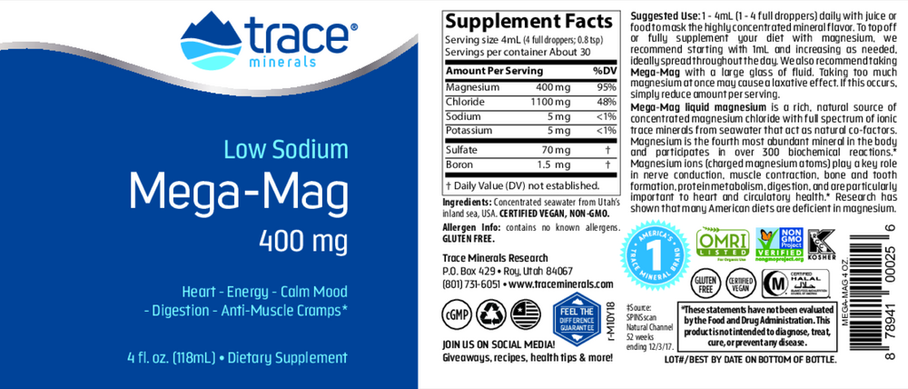 Mega-Mag Liquid Magnesium is a rich, natural source of concentrated magnesium ions with other minerals and trace elements that act as natural co-factors. Vegan Formula.