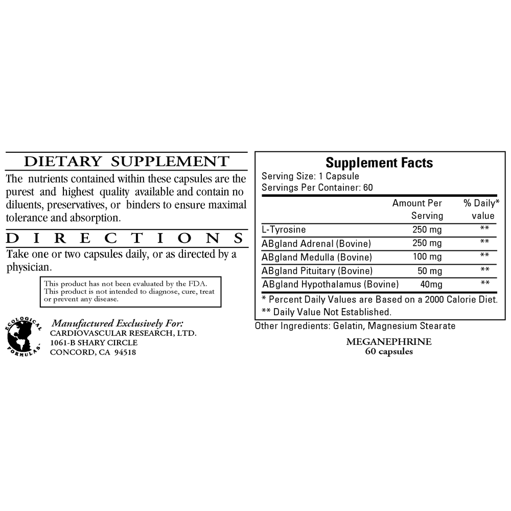 Meganephrine by Ecological Formulas is a dietary supplement designed to support the healthy functioning of the adrenal glands.* Proper functioning of the adrenal glands is crucial for good health since they aid the body in responding to stressful situations in addition to manufacturing such key hormones as epinephrine, cortisol and norpinephrine. The high quality, pure ingredients found in Meganephrine by Ecological Formulas are sourced from New Zealand bovine and include pituitary extract, AB gland adrenal, and Bovine Hypothalamus, all of which support adrenal gland function, especially during times of stress.*