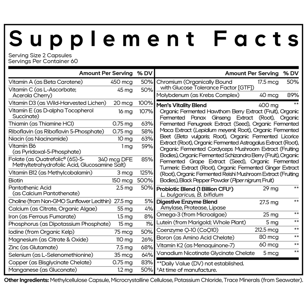 • These men's vitamins also feature probiotics, a digestive enzyme blend, organic turmeric, black pepper powder, and CoQ10 to elevate this formula further.