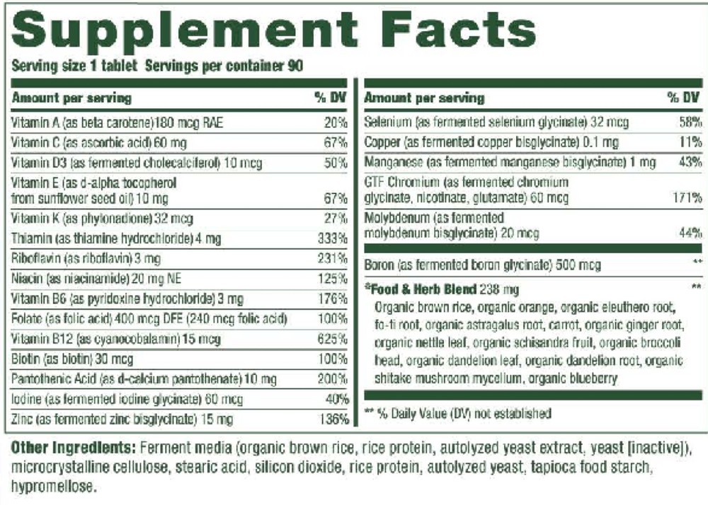 Organic Eleuthero Root, Fo-Ti Root, Organic Astragalus Root, Organic Ginger Root, Organic Nettle Leaf, Organic Schisandra Berry, Fruit Phenolic Blend (Organic Whole Orange, Organic Cranberry, Organic Blueberry), Organic Dandelion Leaf, organic Dandelion Root, Organic Shiitake Mushroom Mycelium