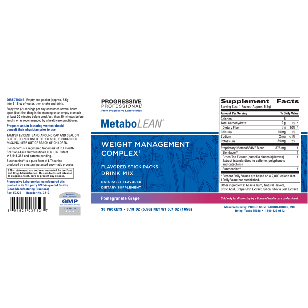 Ingredient Quantity Proprietary MetaboLEAN ® Blend 875 mg Slendacor® - Green Tea Extract - Suntheanine® - Other Ingredients: Acacia Gum, Natural Flavors,.Serving size: 1 Packet