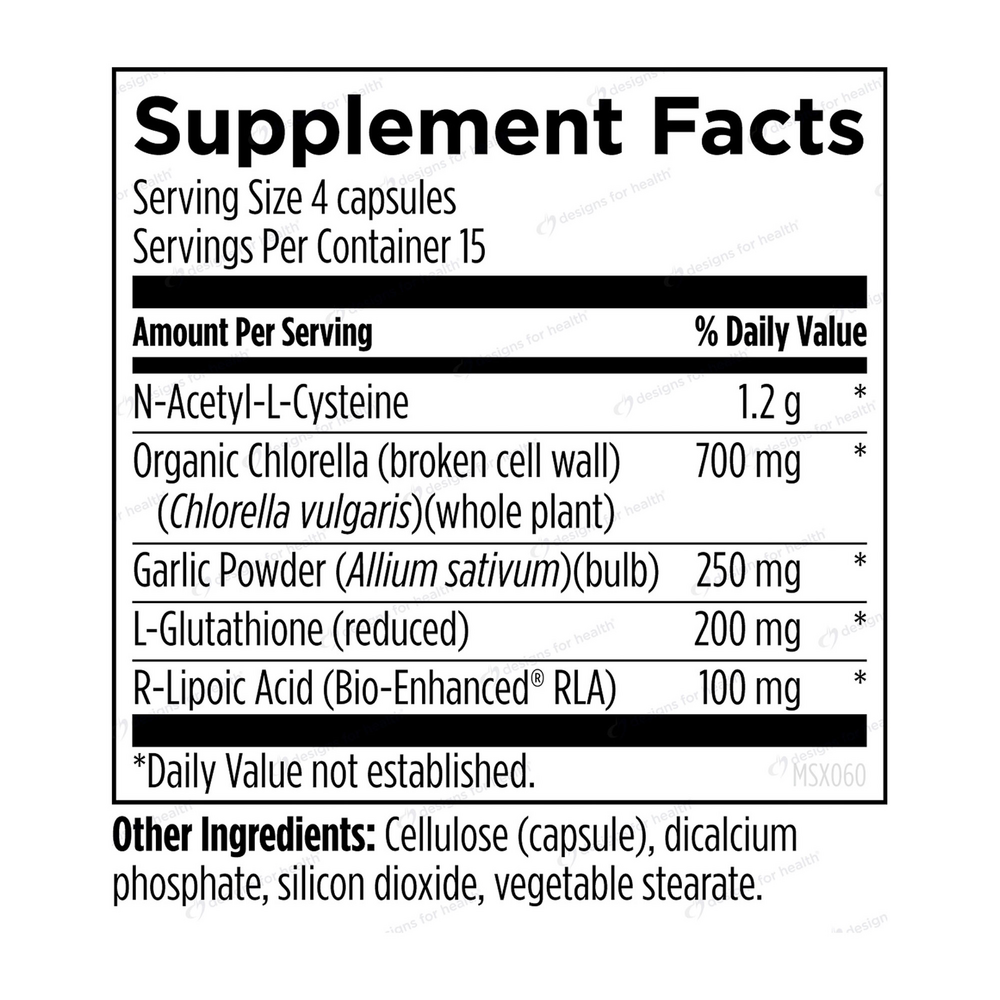 Metal-X-Synergy™ is formulated to support the body’s natural clearance of toxic metals such as aluminum, arsenic, cadmium, lead, and mercury.* Each 4-capsule serving delivers 1.2 g of N-acetyl-cysteine and clinically relevant amounts of reduced glutathione, organic chlorella, garlic powder, and R-lipoic acid to promote healthy detoxification and elimination pathways.* The ingredients work synergistically to help the body clear the total heavy metal burden and support antioxidant status without the common complaints associated with the use of harsh synthetic chelating agents.*