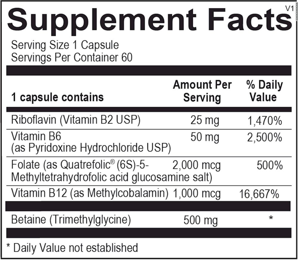 The formula includes key methylation vitamins B2, B6 and B12 (methylcobalamin). This specific blend of methyl donors supports methylation, homocysteine balance, neurotransmitter production, healthy hormone balance and optimal detoxification.*