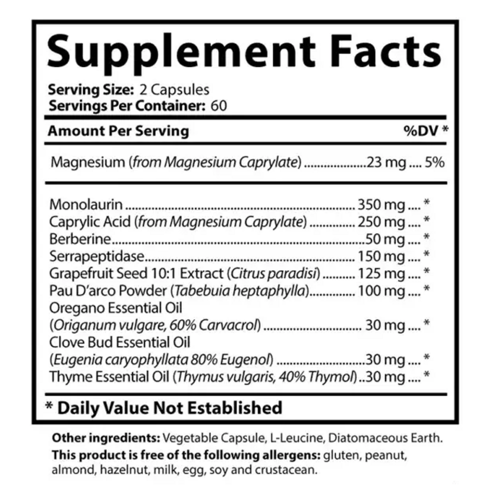 This supplement includes Monolaurin, Caprylic Acid, Grapefruit Seed extract, and Berberine to help maintain healthy gut bacteria levels and to maintain healthy yeast levels in the gut. Pau d’arco also helps maintain healthy gut yeast levels and has a mild laxative effect to keep things moving.