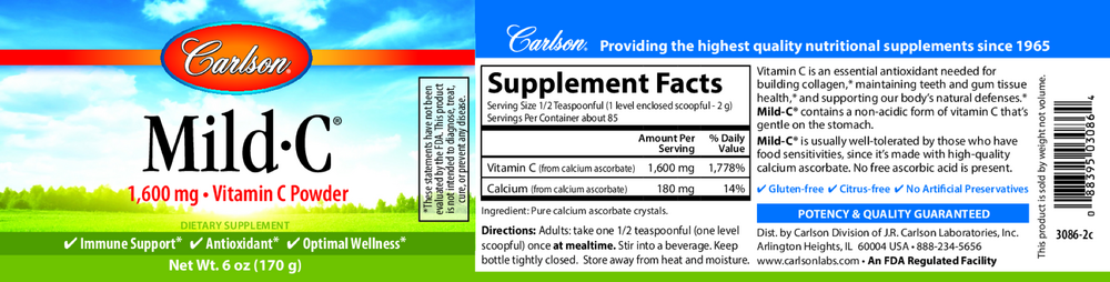 Vitamin C is an essential antioxidant that supports healthy immune system function, teeth, and gum tissue health, and the body's natural defense system.* Carlson Mild C® Powder is made from pure calcium ascorbate, a combination of calcium and vitamin C, making it mild on the teeth and gentle in the stomach. Each 1/2 teaspoon contains 1,600 mg of vitamin C. Mild-C® Powder has a light citrus taste and can be placed in water or a flavored drink.