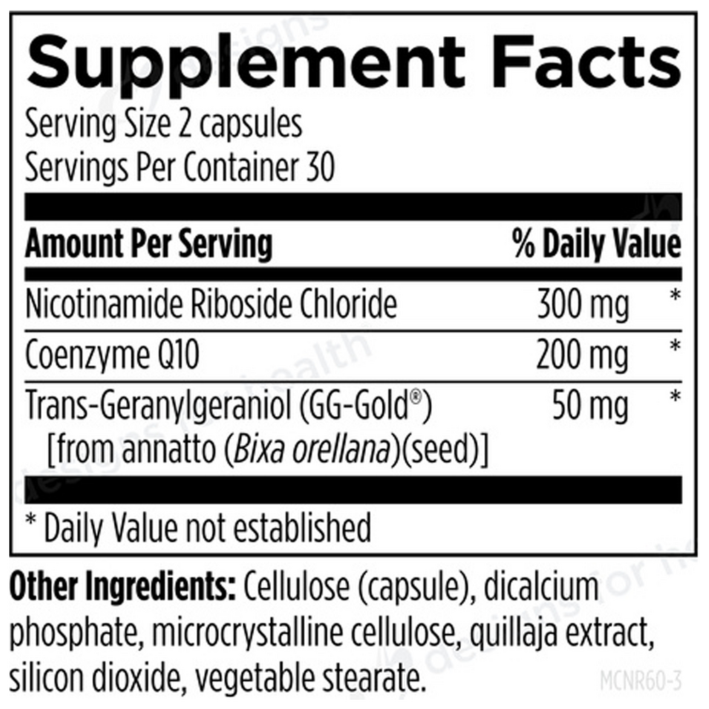 Mito-NR™ is uniquely formulated to support cellular energy production and healthy aging.* This formula contains clinically relevant amounts of nicotinamide riboside chloride (NR), coenzyme Q10 (CoQ10), and geranylgeraniol (GG). NR is a variation of vitamin B3 (niacin) and stimulates the production of nicotinamide adenine dinucleotide (NAD+). NAD+ is found in every living cell and is essential to many important cellular processes, including energy production and mitochondrial function.