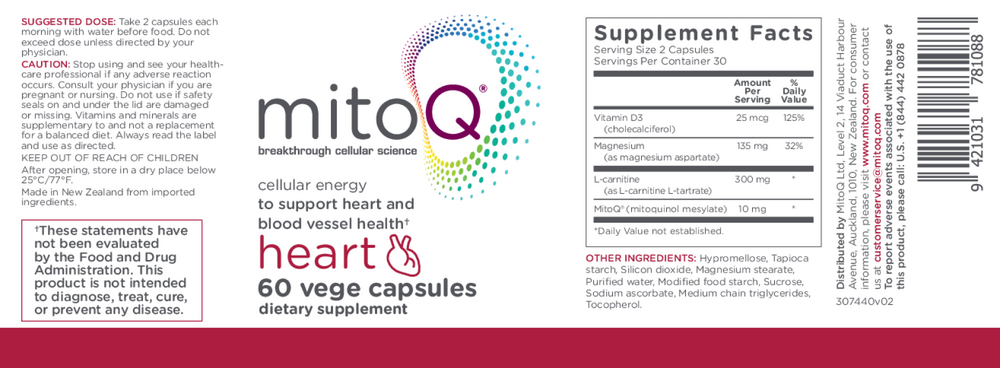 In addition to a full daily recommended dose of MitoQ®'s breakthrough MitoQ 5 mg formula, MitoQ Heart also includes effective levels of heart healthy ingredients Vitamin D3, Magnesium and L-Carnitine.*