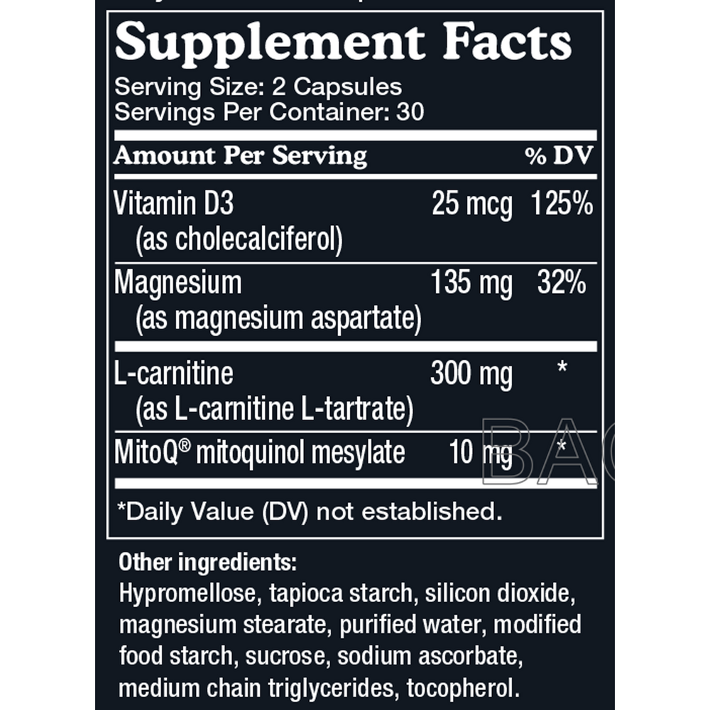 MitoQ: A shortened form of the antioxidant ubiquinol (a CoQ10) with the addition of an ion called Triphenylphosphonium, which givens it a positive charge. These two modifications enable MitoQ to pass through the mitochondrial membrane, where it provides a payload of free radical defense and helps optimize the energy production process.*