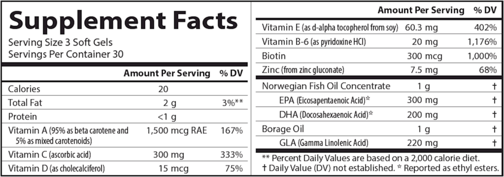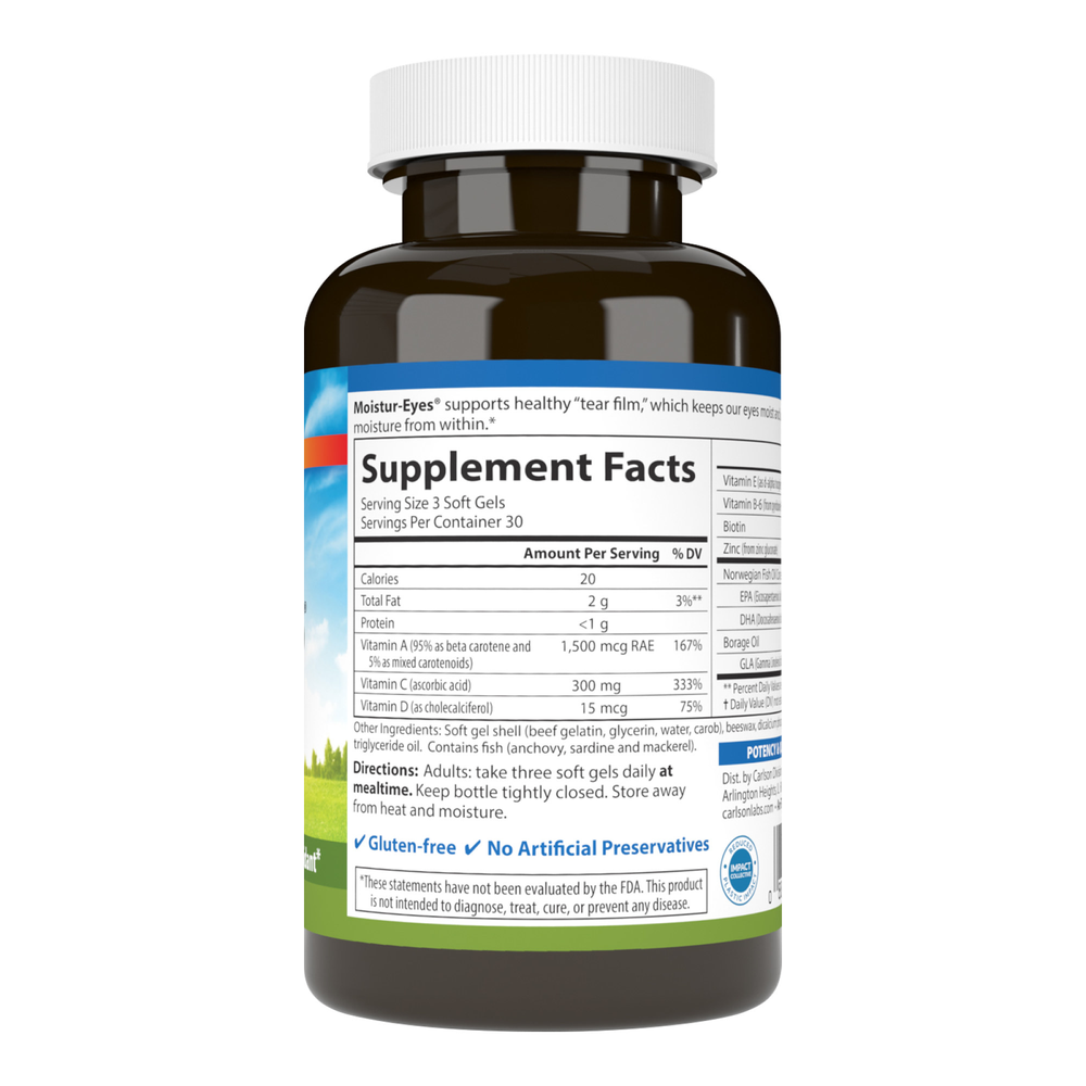 Moistur-Eyes® provides the important nutrients that promote and maintain normal eye moisture and lubrication from within the body, including the omega-3s EPA and DHA; GLA from borage oil; the important antioxidant vitamins A, C, and E; and the mineral zinc. Help keep your eyes moist and hydrated with Moistur-Eyes®.*