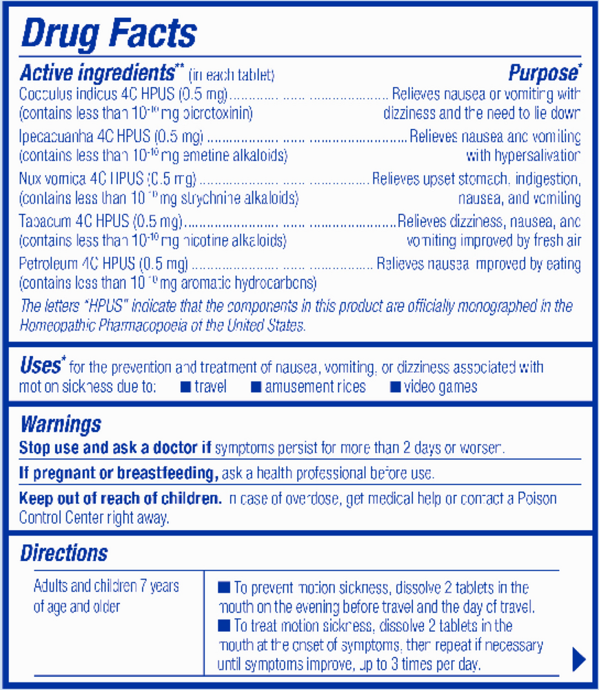 Take the worry out of travel with MotionCalm by Boiron. This homeopathic medicine prevents and relieves nausea, vomiting, and dizziness associated with travel-related motion sickness.* It's also useful for motion sickness from amusement rides or video games.* Convenient and easy to use, the meltaway tablets dissolve in the mouth without food or water. Take the evening before and day of travel to prevent motion sickness or take on the spot whenever symptoms strike.MotionCalm works gently on the body without risk of drowsiness, and is free of meclizine, antihistamines, and caffeine. Formulated with plant-based and other pure active ingredients, this medicine has no interactions with other medications, herbs, or supplements. And it's made without artificial sweeteners, flavors, colors, or preservatives. Each travel-friendly box contains 60 unflavored meltaway tablets recommended for adults and children ages 2 and up. For young children, tablets may be dissolved in water for easier intake. Boiron's digestive relief line includes Acidil, Gasalia, Diaralia, and NauseaCalm™.