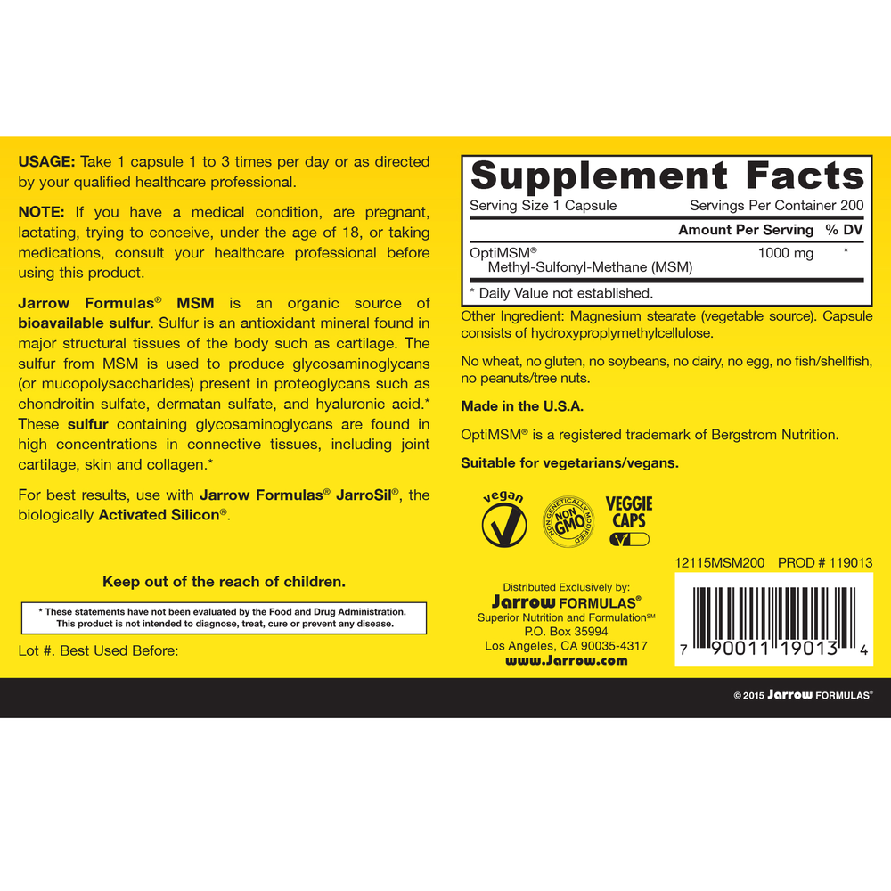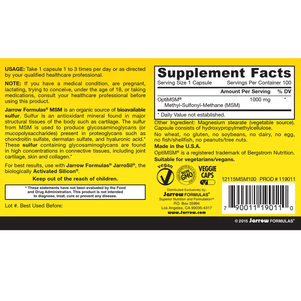 "Jarrow Formulas® MSM is an organic source of bioavailable sulfur. Sulfur is an antioxidant mineral.* Sulfur is found in the human body in structural proteins, such as chondroitin sulfate, dermatan sulfate and hyaluronic acid.