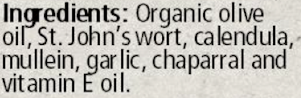 Suggested Use: Shake Well. Apply externally as needed. Do not use internally. Amount Per Serving Organic olive oil, St. Johns wort, calendula, mullein, garlic, chaparral and vitamin E oil (soy based).