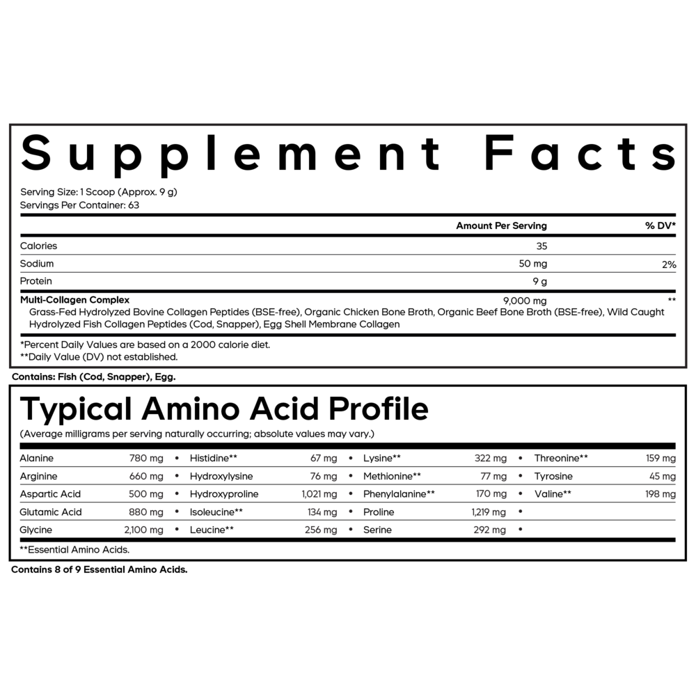 • All-in-one premium multi collagen supplement powder providing 5 collagen types (1, 2, 3, 5, and 10) from 5 high-quality food sources of collagen peptides - grass-fed hydrolyzed bovine collagen, organic chicken bone broth, organic beef bone broth, hydrolyzed wild-caught white fish, and eggshell collagens.