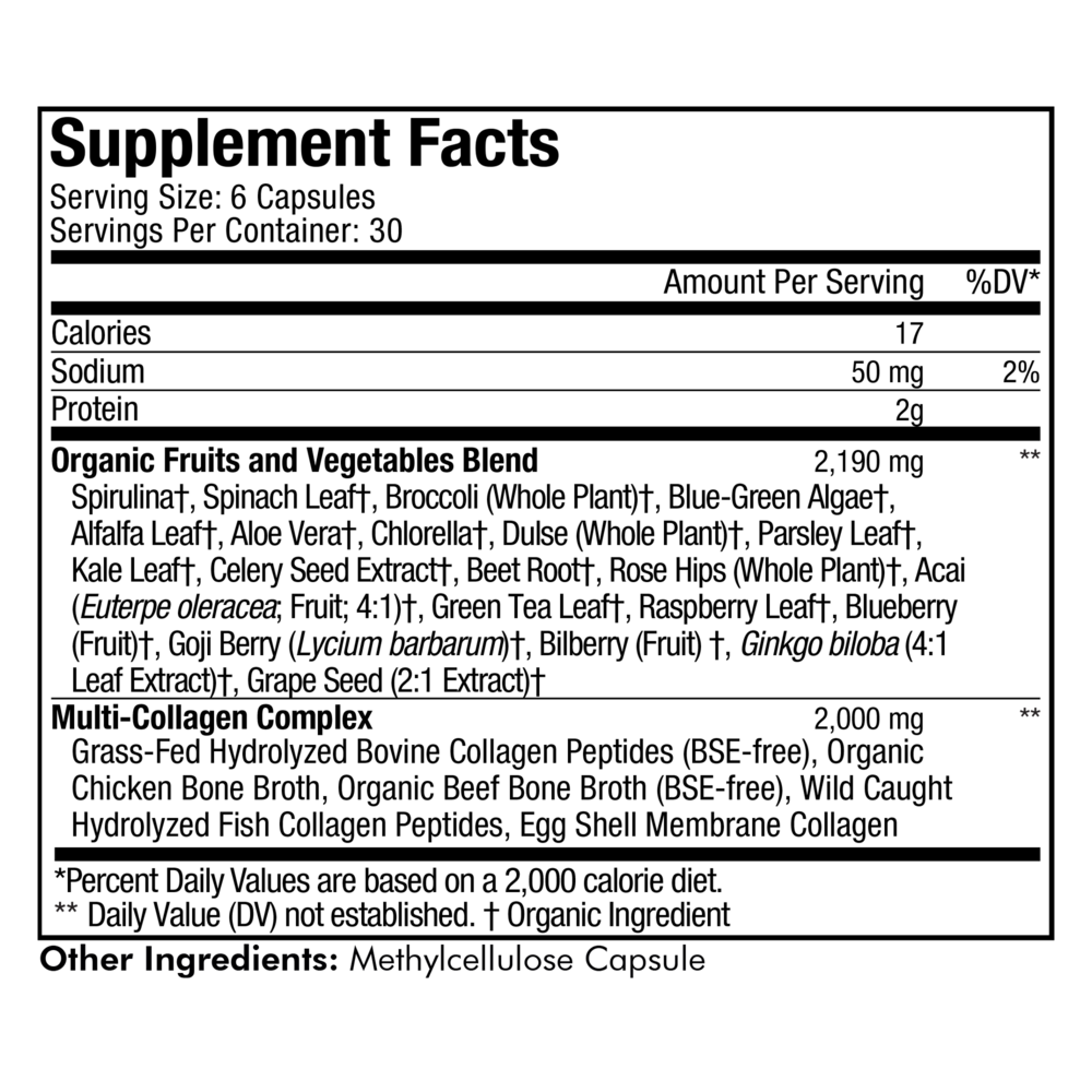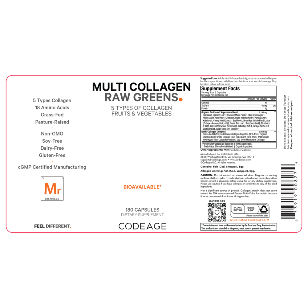 Codeage Multi Collagen Raw Greens offers a premium collagen formula that delivers five collagen types (type 1, 2, 3, 5 & 10) and features 21 organic fruits and vegetables all-in-one. This multi collagen capsule solution provides organic bone broth, organic greens, fruits and whole food vitamins for an advanced hydrolyzed multi collagen solution in an easy and simple to use pills format for both men and women. The hydrolyzed collagen comes from 5 premium sources including grass fed hydrolyzed bovine collagen peptides, organic chicken bone broth, organic beef bone broth, wild caught hydrolyzed fish collagen, and eggshell membrane. The formula is also a unique source of glucosamine, chondroitin, and organic green. This collagen formula features 21 organic plant nutrients, raw organic fruits and greens ingredients in a single solution. This includes spirulina, broccoli, celery seed extract, beet root, grape seed.