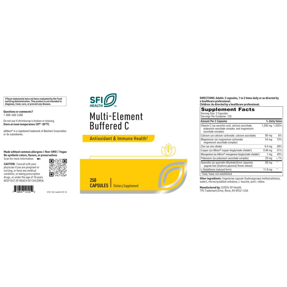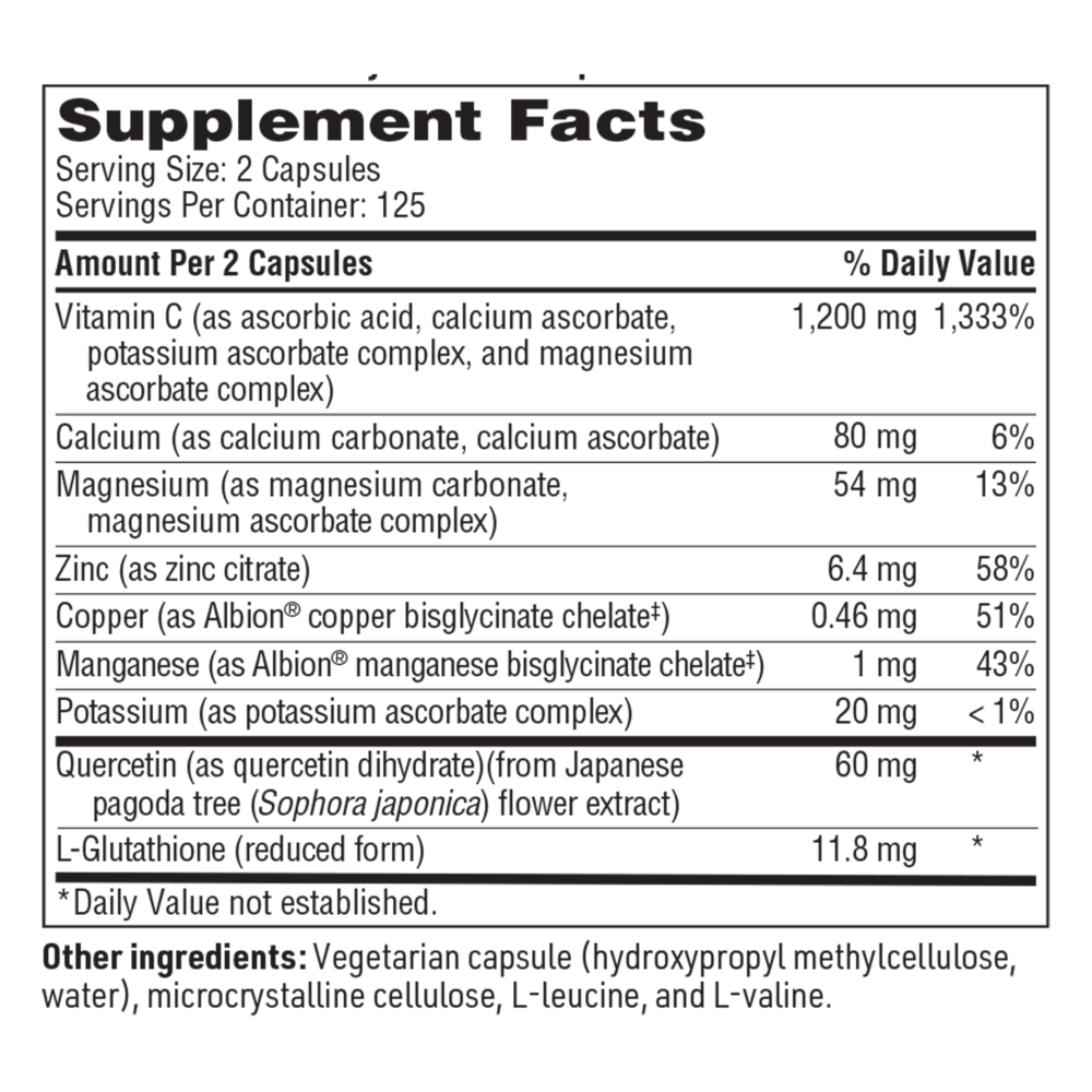 Vitamin C is important for immune function and antioxidant protection, as well as collagen and connective tissue production.† Multi-Element Buffered C adds calcium, magnesium, and potassium to ascorbic acid to create a buffered product that is gentle on the stomach. This formulation includes zinc, manganese, and copper in well-utilized forms. Quercetin, a powerful bioflavonoid, and reduced L-glutathione, an antioxidant, are included to potentiate the function of vitamin C.†