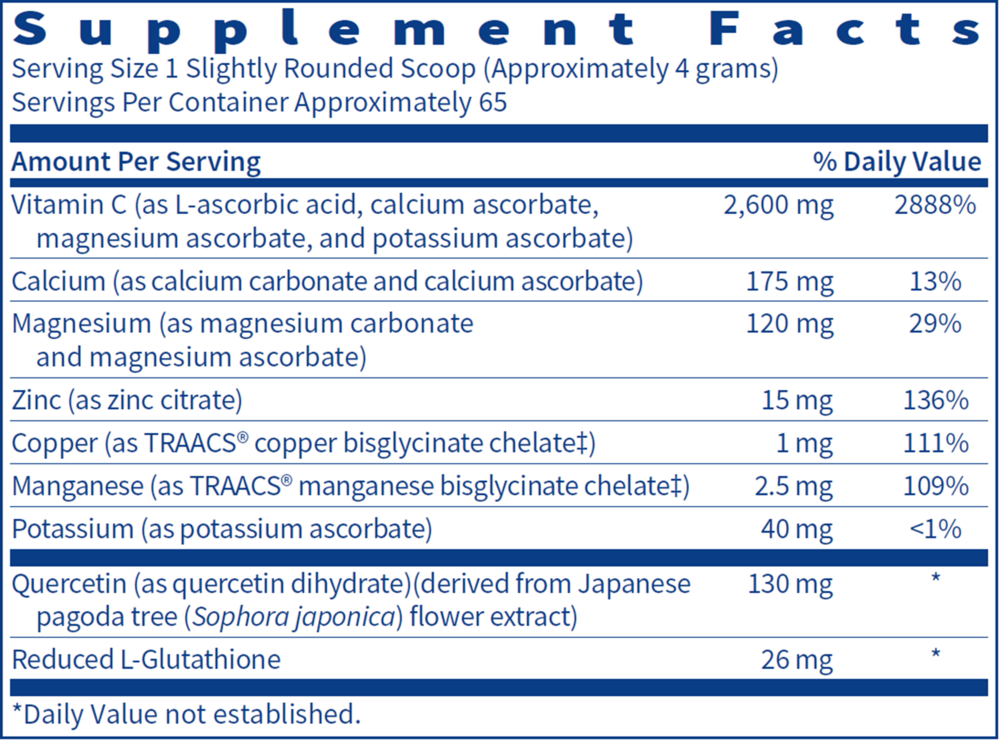 Vitamin C is important for immune function and antioxidant protection, as well as collagen and connective tissue production.* Multi-Element Buffered C adds calcium, magnesium, and potassium to ascorbic acid to create a buffered product that is gentle on the stomach. This formulation includes zinc, manganese, and copper in well-utilized forms. Quercetin, a powerful bioflavonoid, and reduced L-glutathione, an antioxidant, are included to potentiate the function of vitamin C.*