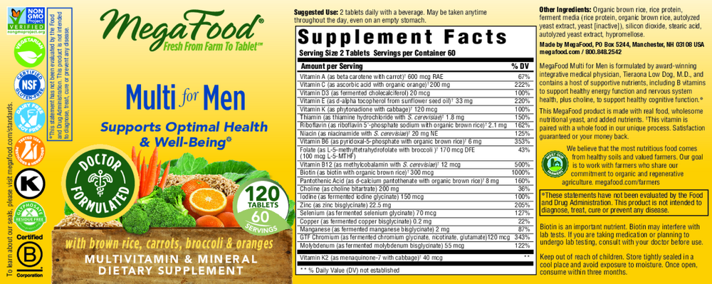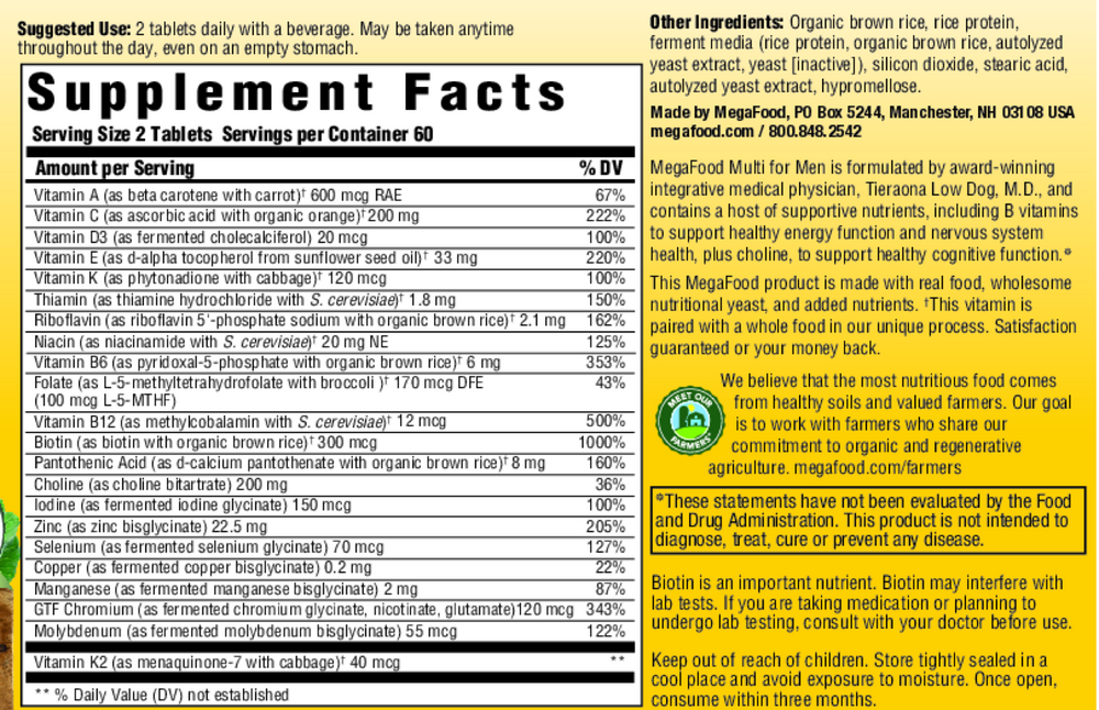 MegaFood® Multi for Men is formulated by an award-winning integrative medical physician, Tieraona Low Dog, M.D., specifically for men who want a multi without iron, magnesium or calcium (not recommended for men unless requested by a healthcare practitioner) that supports their optimal health and wellbeing.* Megafood's tablets are gentle enough to be taken on an empty stomach, and are crafted with a host of supportive FoodState® Vitamins and Minerals, including B vitamins to support healthy energy function and nervous system health*, choline for healthy memory and cognitive function*, iodine, and methylated folate and B12, plus the active form of B6, P5P.