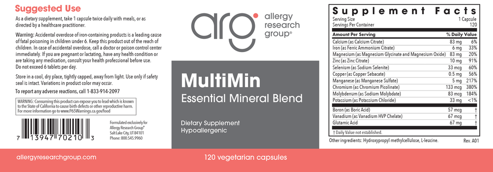 Allergy Research Group's classic mixed mineral formulation, as developed by Stephen A. Levine, Ph.D. MultiMin provides macrominerals, trace minerals, and ultra-trace minerals. Glutamic acid is included as a mildly acidifying agent.*