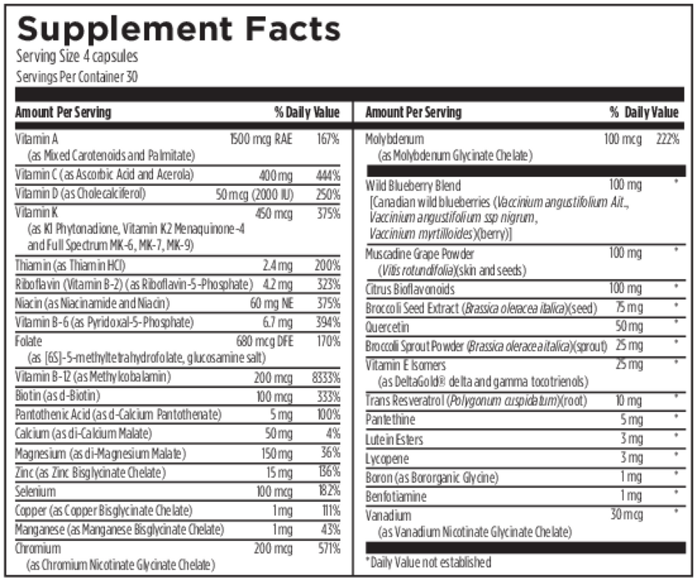 Multi + Phyto is a first-of-its-kind multivitamin, mineral and phytonutrient blend specifically formulated to mimic the nutrient intakes found in an optimal evolutionary human diet. The levels of nutrients provided by Multi + Phyto were devised based on the concept of evolutionary adaptation of human physiology and correspond to a whole food, nutrient-dense diet with ingredients that have been sourced to be naturally occurring or bioidentical. In addition to key vitamins and minerals, this formula includes select phytonutrients to have beneficial effects (such as lutein, lycopene, resveratrol, wild blueberry, broccoli seed/sprout, citrus bioflavonoids and more), which were likely consumed in greater quantities in the evolutionary past than they are in the modern diet.