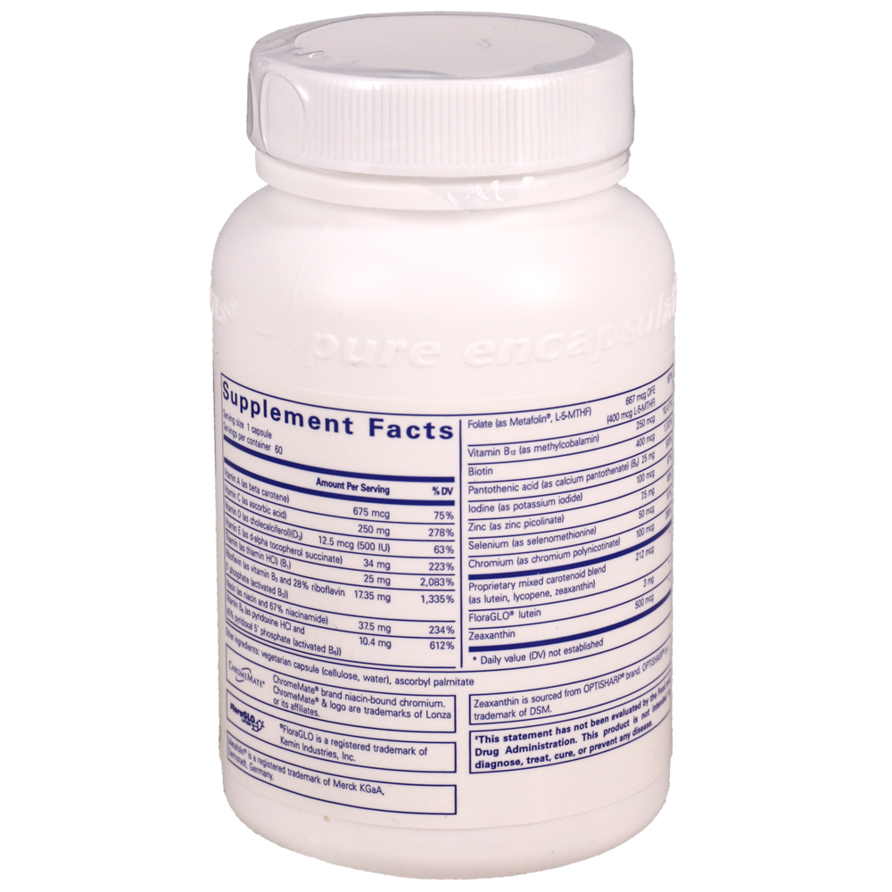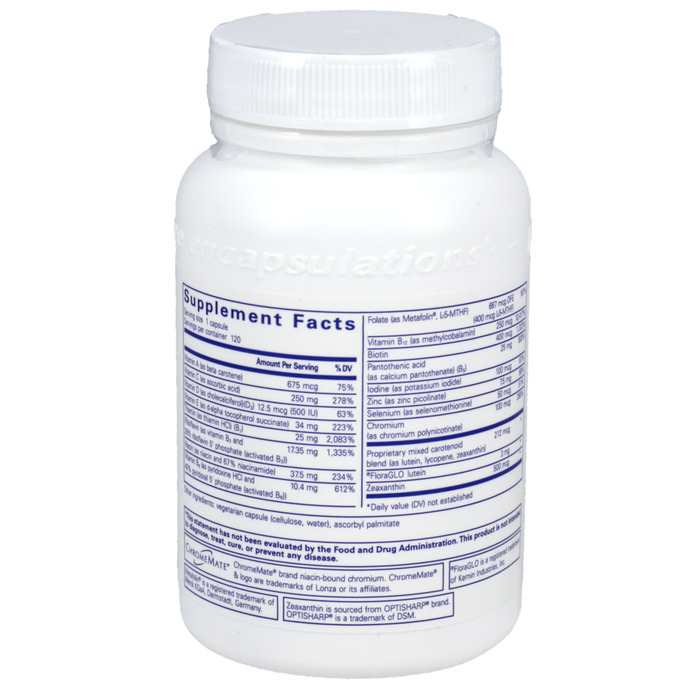 • Supports the integrity of the macula and retina with lutein and zeaxanthin. Synergistic cofactors include vitamin C, vitamin E, zinc and carotenoids.*